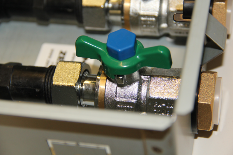 Die Minol Messstation Mini in Durchgangsausführung ist mit DVGW zertifizierten Kugelhähnen und lösbaren Verschraubungen für Aufputzzähler G ¾ B x 80 mm ausgestattet.